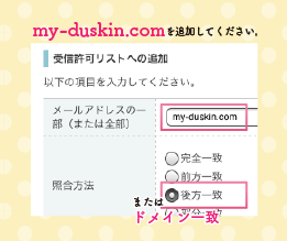 「 my-duskin.com 」を受信許可リストに入力して、ドメイン一致または後方一致を選択します。
