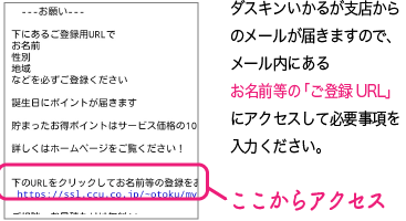 ダスキンいかるが支店からのメールが確実届くように、受信を許可する設定をお願いしております。
