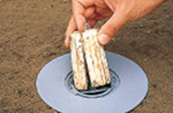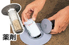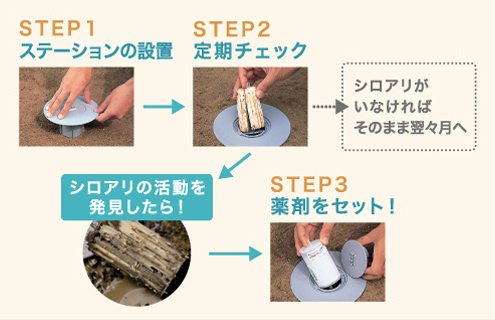 まずシロアリを確認するためにステーションを設置。シロアリの活動を発見したら薬剤をセットして巣全体に効果的に薬剤が広がります。