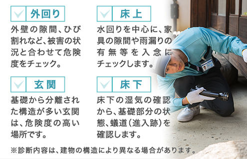 まさかシロアリ?と思ったら、まずは無料診断をご利用ください。診断のプロが約1時間程度でシロアリ被害の有無と可能性を徹底的にチェックします。